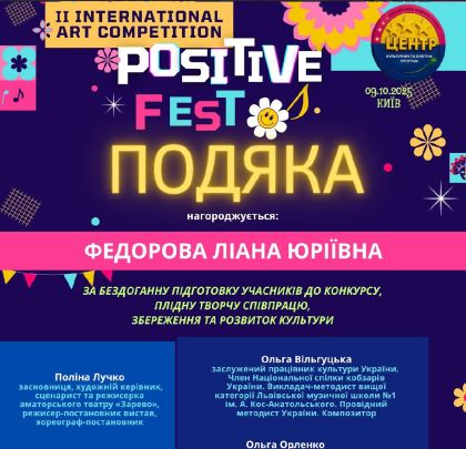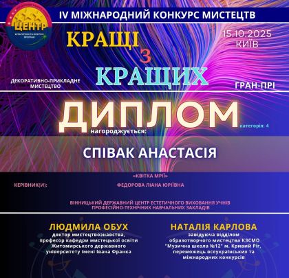 ФЕОКТІСТОВУ-ВАРШАВСЬКУ Аліну, володарку І премії Всеукраїнського конкурсу «POSITIV FEST» та СПІВАК Анастасію, володарку ГРАН-ПРІ IV Міжнародного конкурсу мистецтв «Кращі з кращих», вихованок гуртка декоративно-прикладного мистецтва «Флористика і живопис» Вінницького державного центру естетичного виховання учнів професійно-технічних навчальних закладів, а також ФЕДОРОВУ Ліану за професійну підготовку переможців конкурсів!